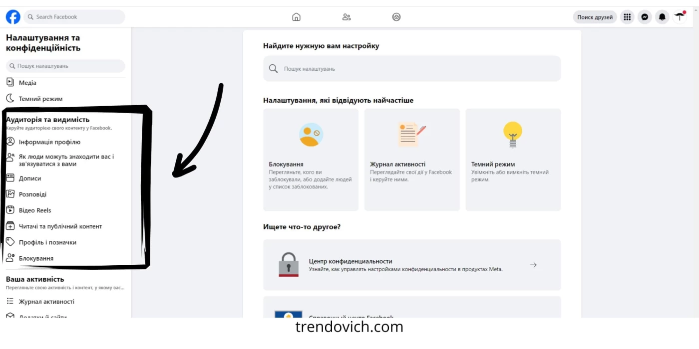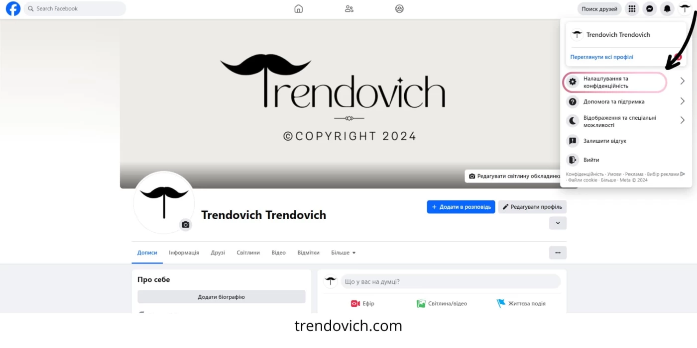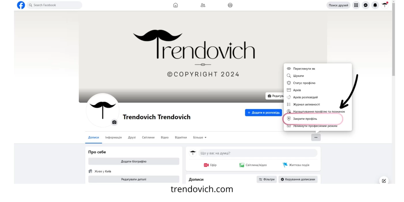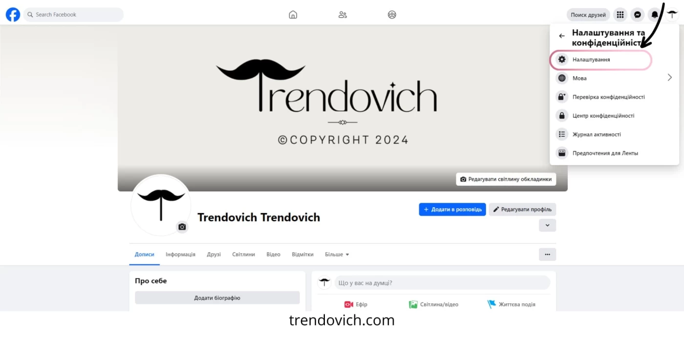 Щоб закрити профіль у Фейсбуці з комп’ютера, необхідно: